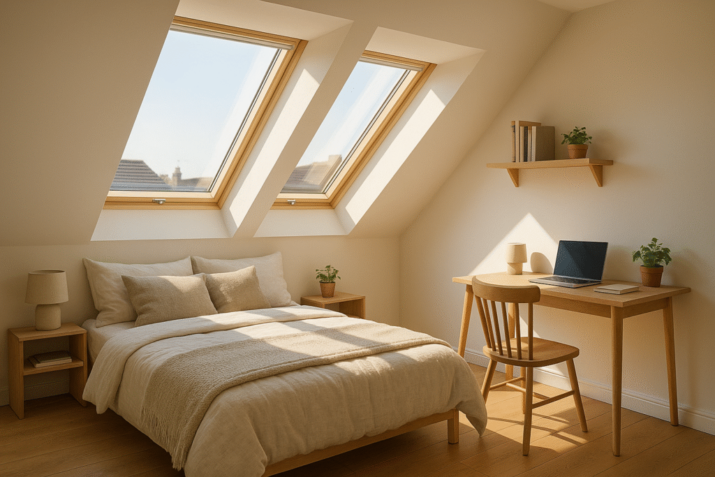 - Soundproofing: Velux loft conversions are especially vulnerable to noise from rain, wind, or noisy neighbours. Noiseproofing can be as simple as double-glazed or triple-glazed windows.